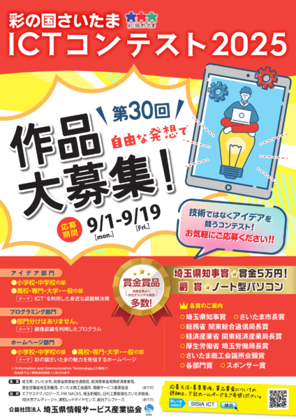 公益社団法人埼玉県情報サービス産業協会主催の「ICTコンテスト2025」は、高度情報化促進と情報化に関する知識の普及・啓発を目的として、毎年実施されているコンテストです。